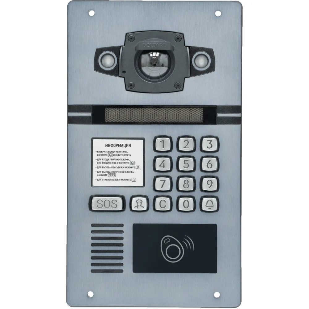Beward DKS977969 - вызывная панель, разработана на базе IP домофона Beward DKS15122 и совместима с облачными сервисами домофонии Форпост и РосдомофонОтличительные собенности Поддержка аналоговых и IP абонентских устройств Вызывная панель DKS977969 является гибридной, при необходимости панель может быть интегрированна к существующей сети аналоговых абонентских трубок. Работа с облачными сервисам Поддержка SIP протокола позволяет использовать IP панель совместно с облачными сервисами для мобильных устройств: Форпост и Росдомофон. Поддержка магнитного и электромеханического замка на 1 вход Антивандальный корпус IP65 Металлический антивандальный корпус домофона не позволит злоумышленникам вывести его из строя. Благодаря температурному диапазону от -50 до +60°C возможна эксплуатация домофона в любом регионе. Широкий угол обзора камеры - 125° по горизонтали Наличие встроенной ИК-подсветки Позволяет передавать видеосиглнал на расстоянии до 3 метров в темное время суток. Встроенный считыватель карт доступа Наличие RFID считывателя стандарта Mifare позволяет организовать проход в подъезд по беспроводным меткам. Бесплатное ПО Бесплатное профессиональное ПО в комплекте. Комплект поставки