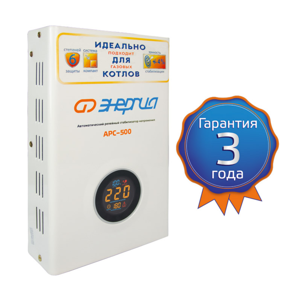Релейный однофазный стабилизатор напряжения переменного тока предназначен для стабилизации переменного напряжения в сети электроснабжения для потребителей бытового и аналогичного назначения. Использование стабилизатора в производственных средах с повышенной опасностью всех категорий категорически запрещено.Стабилизаторы напряжения серии АРС разработаны специально для защиты котельного оборудования от перепадов и скачков сетевого напряжения. Стабилизаторы серии АРС настенного крепления удобны в работе и обладают оптимальной точностью стабилизаторов для обеспечения бесперебойной работы оборудования.Современный эргономичный дизайн, продуманность конструкции, универсальность устройства (несмотря на адаптированность к отопительному оборудованию, устройство также может использоваться и с любой другой бытовой техникой) – это и многое другое делают стабилизаторы напряжения Энергия АРС незаменимым инструментом для защиты котельного оборудования.Стабилизатор обеспечивает:основные технические характеристики;индикацию основных режимов работы стабилизатора, входного и выходного напряжения;автоматическое отключение нагрузки при коротком замыкании или перегрузке;автоматическое отключение нагрузки при появлении на выходе стабилизатора опасного для подключенной нагрузки пониженного или повышенного напряжения;непрерывный, круглосуточный режим работы.Изделие соответствует требованиям российских и международных стандартов.