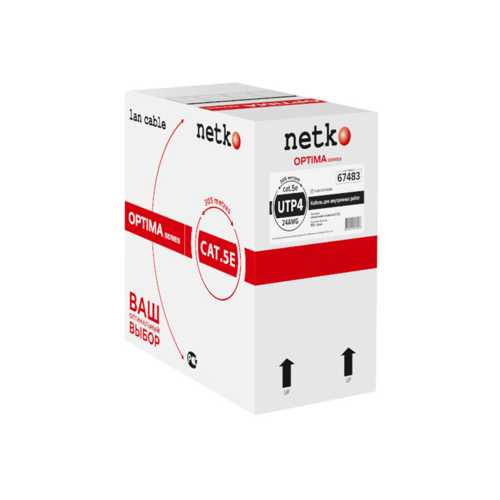 Витая пара (Twisted Pair) — кабель связи, в основном применяемый для организации структурированных кабельных систем (компьютерных сетей, телефонных сетей). Кабель выполнен в виде свитых попарно изолированных проводников. Номенклатура витой пары очень обширна – от одной витой пары до нескольких десятков. В многопарном кабеле, кроме свивки двух проводников между собой, скручиваются сами пары. Такая конструкция витой пары сделана не случайно, это позволяет снизить негативное влияние электромагнитных помех на сигнал, передаваемый по кабелю.NETKO 67483 - четырехпарный неэкранированный (U/UTP), плакированных чистой медью (ССА). Кабель выполнен в неэкранированном исполнении, и является экономичным решением, при этом полностью соответствует заявленной категории 5e.