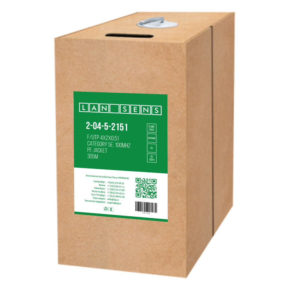 Витая пара (Twisted Pair) — кабель связи, в основном применяемый для организации структурированных кабельных систем (компьютерных сетей, телефонных сетей). Кабель выполнен в виде свитых попарно изолированных проводников. Номенклатура витой пары очень обширна – от одной витой пары до нескольких десятков. В многопарном кабеле, кроме свивки двух проводников между собой, скручиваются сами пары. Такая конструкция витой пары сделана не случайно, это позволяет снизить негативное влияние электромагнитных помех на сигнал, передаваемый по кабелюLANsens 2-04-5-2151 - четырехпарный экранированный (F/UTP) медный кабель типа "витая пара" с цельно-медным проводником (solid) cat.5e и диаметром токопроводящей жилы 0,51мм.Линии связи часто прокладываются в общей трассе с другими кабелям, а также в помещениях с высоким уровнем электрических шумов и помех, которые могут оказать существенное влияние на качество передаваемого сигнала. При этом сам кабель может выступать как приемник электромагнитных помех, так и их источник. Для решения данных проблем применяется экранирование проводников. В витопарном кабеле FTP все пары проводников объединены общим экраном, который защищает сигнал от негативного воздействия электромагнитного излучения и электрических помех.Экран в витопарном кабеле одновременно выполняет 2 функции:1) отражает электромагнитное излучение;2) улавливает электрические шумы и перенаправляет их на шину заземления.Кабель предназначен для использование в структурированной кабельной системе 5 и 5е категории. Кабели категории 5е наиболее часто используются для таких стандартов Ethernet, как 10Base-TX, 100Base-T и 1000Base-T.