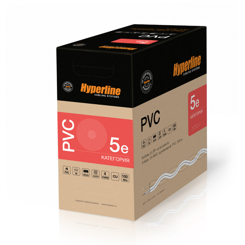 Витая пара (Twisted Pair) — кабель связи, в основном применяемый для организации структурированных кабельных систем (компьютерных сетей, телефонных сетей). Кабель выполнен в виде свитых попарно изолированных проводников. Номенклатура витой пары очень обширна – от одной витой пары до нескольких десятков. В многопарном кабеле, кроме свивки двух проводников между собой, скручиваются сами пары. Такая конструкция витой пары сделана не случайно, это позволяет снизить негативное влияние электромагнитных помех на сигнал, передаваемый по кабелю.Hyperline UUTP4-C5E-S24-IN-PVC-GY-305 - четырехпарный неэкранированный (U/UTP) медный кабель типа "витая пара" с цельно-медным проводником (solid) cat.5e и диаметром токопроводящей жилы 0,51мм.Поддерживаемые приложения:10–1000 Мбит/с Ethernet (10BASE-T, Fast 100BASE-TX, Gigabit 1000BASE-T), ATM-622 Мбит/с, 100VG-AnyLAN, Token Ring, Firewire, другие приложения кабельных систем категории 5e.Соответствие стандартам: IEC 61156, IEE 802.3ab (1000BASE-T) ANSI/TIA-568-C.2, ISO/IEC 11801 (Кат. 5e/ Класс D) PVC FR (flame retardant): CM, UL-1581, IEC 60332-1 LSZH FR (flame retardant): IEC 60332-1, IEC 60754, IEC 61034