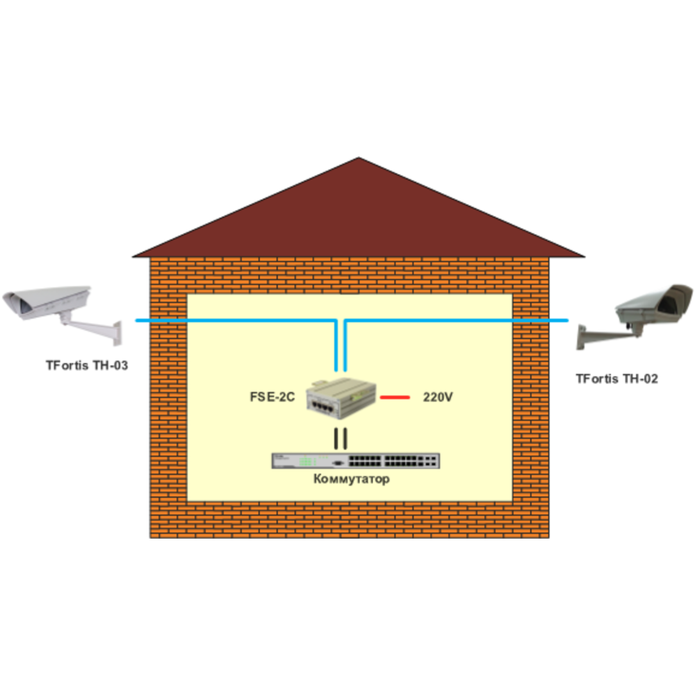 Инжектор FSE-2C предназначен для питания по PoE видеокамер, установленных в термокожух TFortis TH-02 (TH-03), используя при этом всего лишь один UTP/FTP 4-х парный кабель. Питание термокожуха TFortis TH производится по свободным парам (4, 5 и 7, 8), в то время как IP-камера питается через линии, по которым передаются данные (1, 2 и 3, 6). Таким образом, питание термокожуха осуществляется без отбора мощности у видеокамеры. Это оборудование целесообразно использовать в случаях, когда имеется возможность установить сетевое оборудование в отапливаемых помещениях нецелесообразно прокладывать до видеокамер отдельные кабели питания.