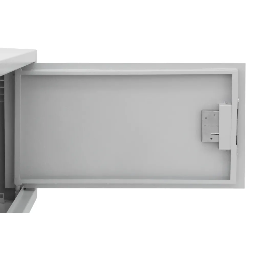 Шкаф имеет цельносварную конструкцию.Крепление к стене анкерными болтами через сквозные отверстия в задней стенке шкафа. Дверь шкафа имеет рамную конструкцию и утоплена на 10мм, фиксируется замком, стойким к подбору ключей и механическим повреждениям. Специально разработанные внутренние шарниры препятствуют вскрытию шкафа путем срезания петель. Внутри установлен болт заземления.Порошково-полимерная окраска RAL7035 или любой другой цвет по предварительному заказу.Чертежи шкафа: