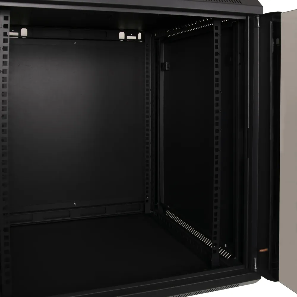 Телекоммуникационные шкафы серии TWC предназначены для компактного размещения оптического и электротехнического оборудования систем передачи данных. Небольшие размеры по сравнению с напольными телекоммуникационными шкафами позволяют размещать не только в закрытых серверных, но и в офисных помещениях, коридорах и лестничных пролётах. Современный дизайн легко и эргономично впишется в любой интерьер.В комплекте идут монтажные вертикальные направляющие для крепления стандартного 19 дюймового оборудования. Направляющие пронумерованы в соответствии с количеством юнитов, для упрощения процесса монтажа. Направляющие регулируются по глубине. Доступ к оборудованию, устанавливаемому в шкафу, может осуществляться с трёх сторон. Шкаф поставляется в разобранном виде.Дверь шкафа стеклянная, стекло 5 мм и поставляется с замком. Установка двери возможна как с правой, так и с левой стороны. Замок защищает от нежелательного доступа третьих лиц в шкаф. Боковые панели шкафов - легкосъемные для упрощения доступа к установленному оборудованию, снабжены защелками.Ввод кабеля осуществляется через верхнюю или нижнюю панели шкафа через предусмотренные кабельные вводы размером 340х56мм. В крышу шкафа предусмотрена установка двух 120мм вентиляторов либо вентиляторного модуля.Сделано в России. Внесено в реестр Минпромторга.Прямое общение с изготовителями настенных шкафов серии SF-RОбсуждаем идеи, отвечаем на вопросы, принимаем критику, созидаем вместе.Телеграм-чат t.me/nagtac Конструкция 1. Рама 2. Боковая дверь 3. Монтажная рама 4. Монтажная направляющая 5. Передняя дверь 6. Замок Габаритные размер Крепление к стене Шкаф крепится к стене при помощи универсальноко кронштейна в четырёх точках. Регулируемые напраляющие Универсальные направляющие регулируются по глубине при помощи крепёжного набора. Максимальное полезное расстояние между направляющими 550мм, длина уголка для оборудования составляет 425мм.