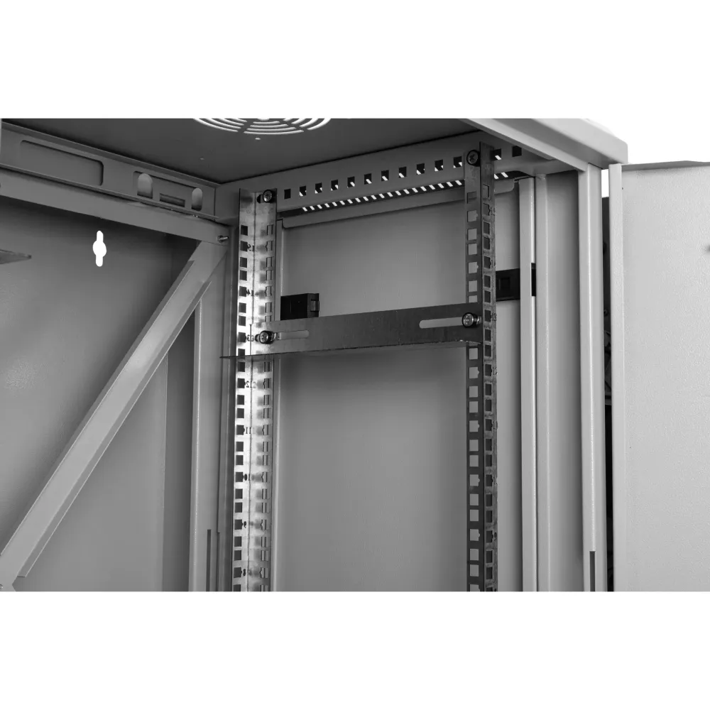 Телекоммуникационные шкафы серии TWD предназначены для компактного размещения оптического и электротехнического оборудования систем передачи данных. Небольшие размеры по сравнению с напольными телекоммуникационными шкафами позволяют размещать не только в закрытых серверных, но и в офисных помещениях, коридорах и лестничных пролётах. Современный дизайн легко и эргономично впишется в любой интерьер.В комплекте идут монтажные вертикальные направляющие для крепления стандартного 19 дюймового оборудования. Направляющие пронумерованы в соответствии с количеством юнитов, для упрощения процесса монтажа. Направляющие регулируются по глубине. Доступ к оборудованию, устанавливаемому в шкафу, может осуществляться с четырёх сторон. Шкаф поставляется в разобранном виде.Дверь шкафа металлическая и поставляется с замком. Установка двери возможна как с правой, так и с левой стороны. Замок защищает от нежелательного доступа третьих лиц в шкаф. Боковые панели шкафов - легкосъемные для упрощения доступа к установленному оборудованию, снабжены защелками.Ввод кабеля осуществляется через верхнюю или нижнюю панели шкафа через предусмотренные кабельные вводы размером 340х56мм. В крышу шкафа предусмотрена установка двух 120мм вентиляторов либо вентиляторного модуля. Конструкция 1. Заглушка (опционально) 2. Задняя дверь 3. Рама 4. Боковая дверь 5. Монтажная направляющая 6. Входная дверь 7. Замок Габаритные размер Крепление к стене Шкаф крепится к стене при помощи анкеров в четырёх точках. Регулируемые напраляющие Универсальные направляющие регулируются по глубине при помощи крепёжного набора. Максимальное полезное расстояние между направляющими 390мм, длина уголка для оборудования составляет 270мм.