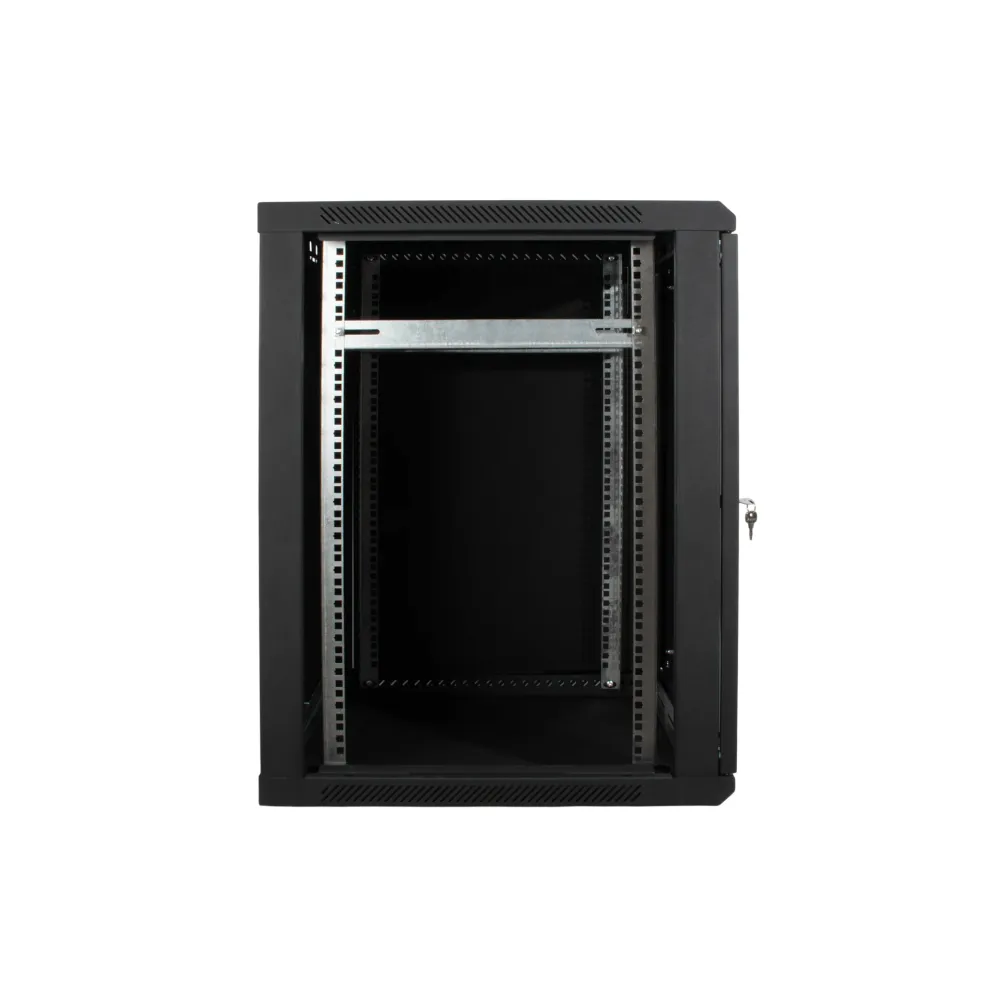 Телекоммуникационные шкафы серии TWC предназначены для компактного размещения оптического и электротехнического оборудования систем передачи данных. Небольшие размеры по сравнению с напольными телекоммуникационными шкафами позволяют размещать не только в закрытых серверных, но и в офисных помещениях, коридорах и лестничных пролётах. Современный дизайн легко и эргономично впишется в любой интерьер.В комплекте идут монтажные вертикальные направляющие для крепления стандартного 19 дюймового оборудования. Направляющие пронумерованы в соответствии с количеством юнитов, для упрощения процесса монтажа. Направляющие регулируются по глубине. Доступ к оборудованию, устанавливаемому в шкафу, может осуществляться с трёх сторон. Шкаф поставляется в разобранном виде.Дверь шкафа стеклянная, стекло 5 мм и поставляется с замком. Установка двери возможна как с правой, так и с левой стороны. Замок защищает от нежелательного доступа третьих лиц в шкаф. Боковые панели шкафов - легкосъемные для упрощения доступа к установленному оборудованию, снабжены защелками.Ввод кабеля осуществляется через верхнюю или нижнюю панели шкафа через предусмотренные кабельные вводы размером 340х56мм. В крышу шкафа предусмотрена установка двух 120мм вентиляторов либо вентиляторного модуля.Сделано в России. Внесено в реестр Минпромторга.Прямое общение с изготовителями настенных шкафов SNR серии SF-RОбсуждаем идеи, отвечаем на вопросы, принимаем критику, созидаем вместе.Телеграм-чат t.me/nagtac Конструкция 1. Рама 2. Боковая дверь 3. Монтажная рама 4. Монтажная направляющая 5. Передняя дверь 6. Замок Габаритные размер Крепление к стене Шкаф крепится к стене при помощи универсальноко кронштейна в четырёх точках. Регулируемые напраляющие Универсальные направляющие регулируются по глубине при помощи крепёжного набора. Максимальное полезное расстояние между направляющими 550мм, длина уголка для оборудования составляет 425мм.