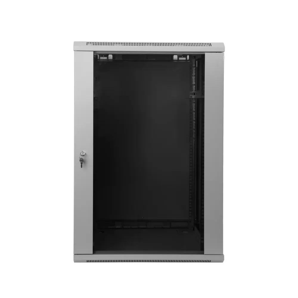Телекоммуникационные шкафы серии TWC предназначены для компактного размещения оптического и электротехнического оборудования систем передачи данных. Небольшие размеры по сравнению с напольными телекоммуникационными шкафами позволяют размещать не только в закрытых серверных, но и в офисных помещениях, коридорах и лестничных пролётах. Современный дизайн легко и эргономично впишется в любой интерьер.В комплекте идут монтажные вертикальные направляющие для крепления стандартного 19 дюймового оборудования. Направляющие пронумерованы в соответствии с количеством юнитов, для упрощения процесса монтажа. Направляющие регулируются по глубине. Доступ к оборудованию, устанавливаемому в шкафу, может осуществляться с трёх сторон. Шкаф поставляется в разобранном виде.Дверь шкафа стеклянная, стекло 5 мм и поставляется с замком. Установка двери возможна как с правой, так и с левой стороны. Замок защищает от нежелательного доступа третьих лиц в шкаф. Боковые панели шкафов - легкосъемные для упрощения доступа к установленному оборудованию, снабжены защелками.Ввод кабеля осуществляется через верхнюю или нижнюю панели шкафа через предусмотренные кабельные вводы размером 340х56мм. В крышу шкафа предусмотрена установка двух 120мм вентиляторов либо вентиляторного модуля.Сделано в России. Внесено в реестр Минпромторга. Конструкция 1. Рама 2. Боковая дверь 3. Монтажная рама 4. Монтажная направляющая 5. Передняя дверь 6. Замок Габаритные размер Крепление к стене Шкаф крепится к стене при помощи универсальноко кронштейна в четырёх точках. Регулируемые напраляющие Универсальные направляющие регулируются по глубине при помощи крепёжного набора. Максимальное полезное расстояние между направляющими 390мм, длина уголка для оборудования составляет 270мм.