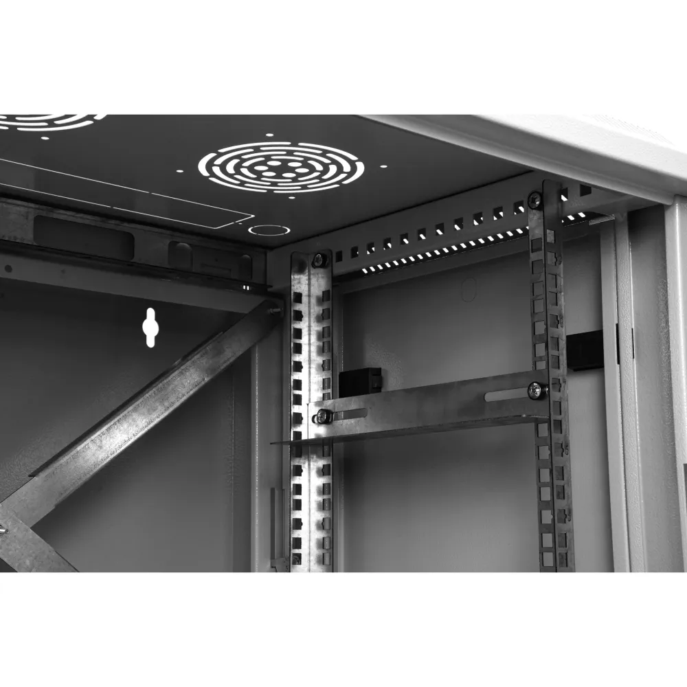 Телекоммуникационные шкафы серии TWD предназначены для компактного размещения оптического и электротехнического оборудования систем передачи данных. Небольшие размеры по сравнению с напольными телекоммуникационными шкафами позволяют размещать не только в закрытых серверных, но и в офисных помещениях, коридорах и лестничных пролётах. Современный дизайн легко и эргономично впишется в любой интерьер.В комплекте идут монтажные вертикальные направляющие для крепления стандартного 19 дюймового оборудования. Направляющие пронумерованы в соответствии с количеством юнитов, для упрощения процесса монтажа. Направляющие регулируются по глубине. Доступ к оборудованию, устанавливаемому в шкафу, может осуществляться с четырёх сторон. Шкаф поставляется в разобранном виде.Дверь шкафа металлическая и поставляется с замком. Установка двери возможна как с правой, так и с левой стороны. Замок защищает от нежелательного доступа третьих лиц в шкаф. Боковые панели шкафов - легкосъемные для упрощения доступа к установленному оборудованию, снабжены защелками.Ввод кабеля осуществляется через верхнюю или нижнюю панели шкафа через предусмотренные кабельные вводы размером 340х56мм. В крышу шкафа предусмотрена установка двух 120мм вентиляторов либо вентиляторного модуля. Конструкция 1. Заглушка (опционально) 2. Задняя дверь 3. Рама 4. Боковая дверь 5. Монтажная направляющая 6. Входная дверь 7. Замок Габаритные размер Крепление к стене Шкаф крепится к стене при помощи анкеров в четырёх точках. Регулируемые напраляющие Универсальные направляющие регулируются по глубине при помощи крепёжного набора. Максимальное полезное расстояние между направляющими 390мм, длина уголка для оборудования составляет 270мм.