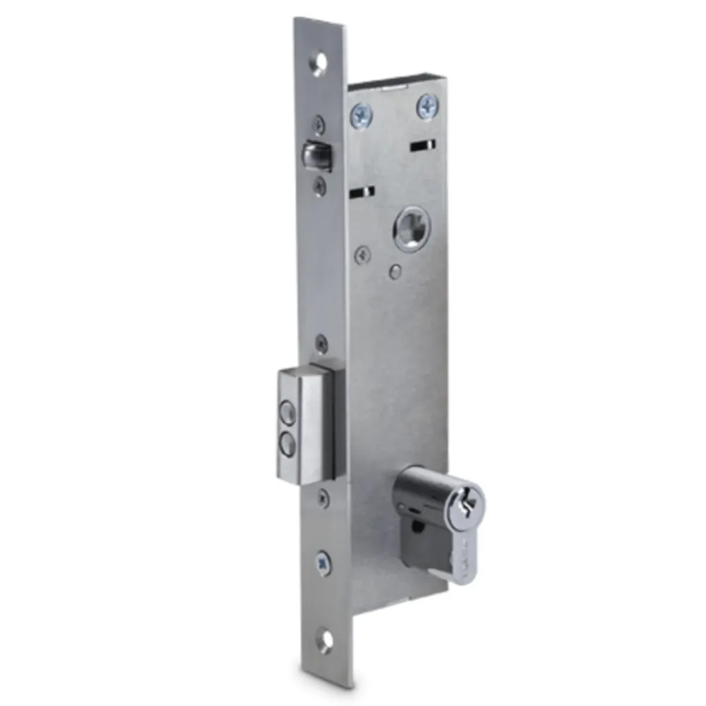 Врезной электромеханический замок с контактным устройством для двери из алюминиевого профиля, нормально закрытый, межцентровое расстояние 85 мм