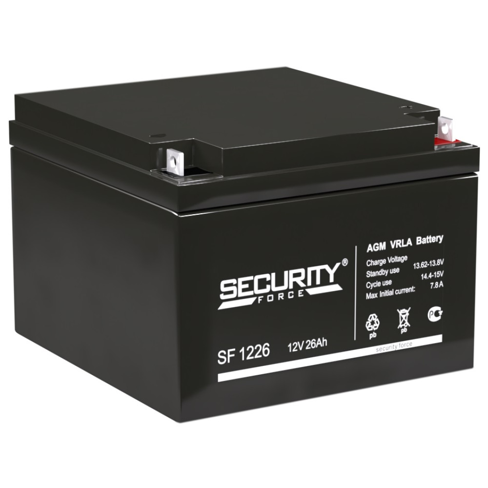 Гарантия продавца: 12 мес.Страна-производитель: ВьетнамОбщие параметрыТип: аккумуляторная батарея для ИБПМодель: SECURITY FORCE SF 1226Исполнение: AGM, свинцово-кислотныйОсновной цвет: черныйТехнические характеристикиЕмкость: 26 А*чКлеммы: B5 (под болт М6 с гайкой)Напряжение: 12 ВМаксимальный ток заряда: 7.8 АВнутреннее сопротивление: 9 мОмВысота с учетом клеммы: 126 ммСрок службы: 5 летРабочий диапазон температурЗаряд: -10 °C ~ 50 °CХранение: -20 °C ~ 50 °CРазряд: -15 °C ~ 50 °CСаморазряд: 3% мес. при 25 °СДополнительная информацияМатериал корпуса: ABS-пластикРучка для переноски: нетГабариты, ВесШирина: 175 ммВысота: 126 ммДлина: 166 мм