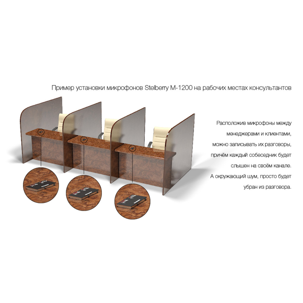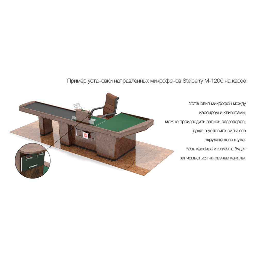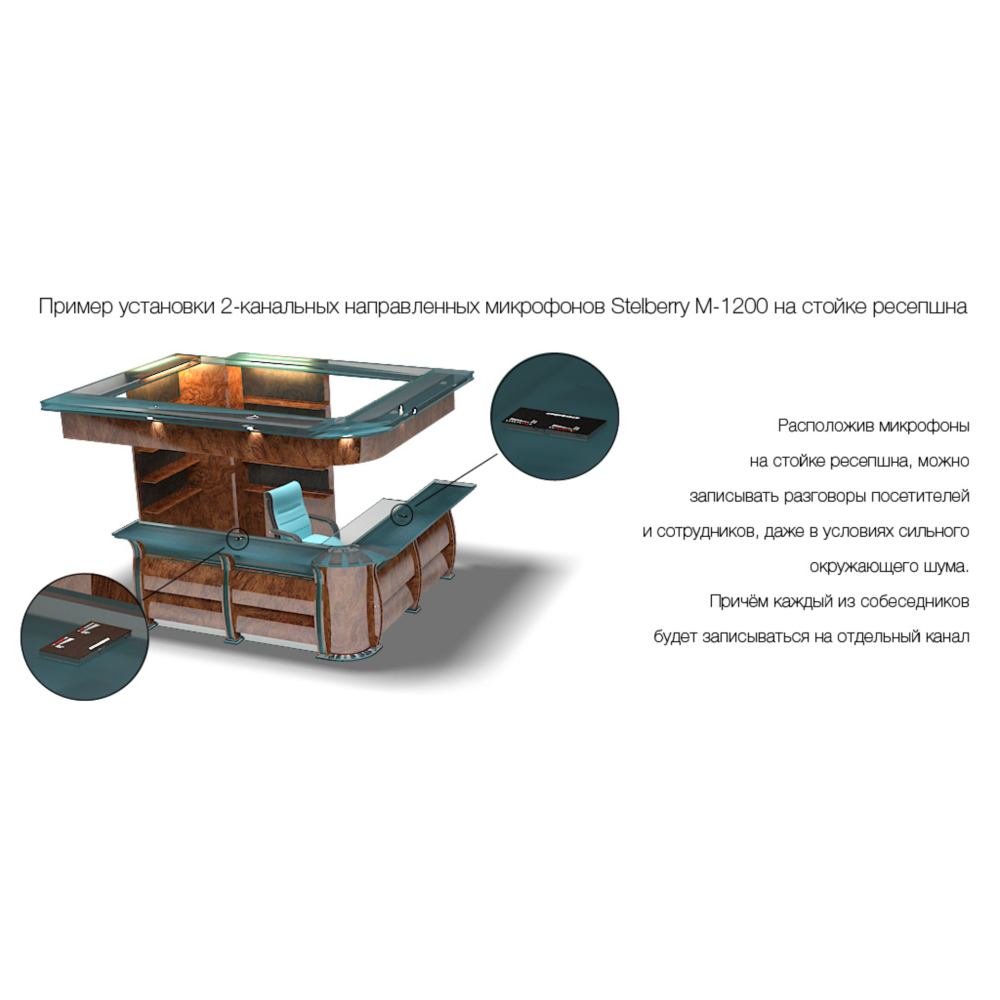 Активный 2-канальный двунаправленный микрофон STELBERRY M-1200 предназначен для качественной 2-канальной записи разговоров между кассирами и клиентами, менеджерами и клиентами, консультантами и клиентами.Речь каждого из собеседников выводится на свой канал. Это очень удобно, так как при последующем прослушивании диалогов, можно услышать каждого из собеседников, даже если они говорили одновременно.Микрофон снабжен раздельными регулировками чувствительности и направленности, позволяющими настроить качество звука для различных вариантов установки.Удобству подключения, при монтаже направленного микрофона STELBERRY M-1200, способствует наличие миниатюрных разъёмов и ответных соединительных кабелей в комплекте поставки. Монтажнику достаточно ознакомиться с «Инструкция пользователя»для правильного подключения и настройки микрофона.Область применения 2-канального двунаправленного активного микрофона Stelberry M-1200 2-канальная запись разговоров между кассирами банка и клиентами 2-канальная запись разговоров между кассирами магазина и покупателями при высоком окружающем шуме Раздельная запись разговоров между оператором АЗС и клиентами 2-канальная запись разговоров между продавцами и покупателями в шумных торговых центрах Раздельная запись общения между врачами и пациентами в стоматологических клиниках Раздельная запись переговоров врача с пациентами 2-канальная запись разговоров между консультантами и абонентами в салонах мобильной связи
